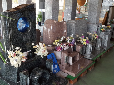 - 当社の「展示場」では、常時、15基のさまざまななタイプの墓石をご用意しておりますので、デザインや銘石の質感を実際に目で見て、触れていただけます。また、全優石認定の「お墓相談員」の資格を持ったスタッフがおりますので、墓石の特長やご予算、お墓づくりに関する疑問・質問などお気軽にご相談ください。